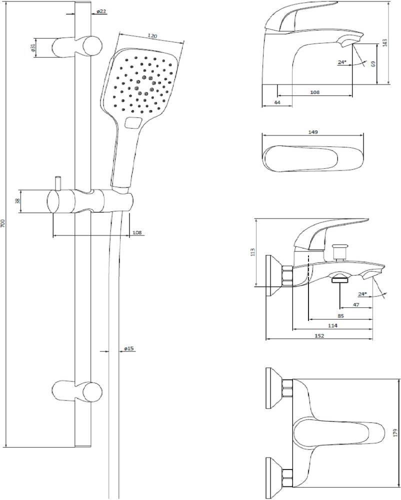 - аэратор, душевая лейка, душевая штанга, держатель душевой лейки, душевой шланг, смеситель