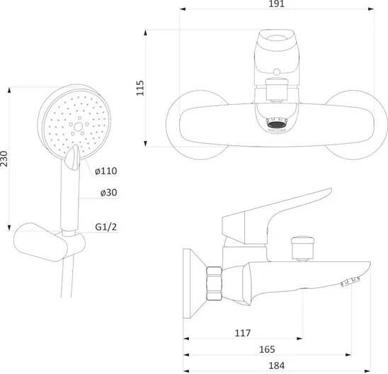 - аэратор, душевая лейка, держатель душевой лейки, душевой шланг, смеситель