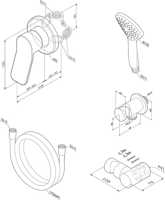 - душевая лейка, держатель душевой лейки, душевой шланг, смеситель
