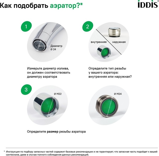 Аэратор IDDIS® представляет собой сетчатую насадку на смеситель, предназначенную для насыщения воды кислородом без заметного снижения напора струи. Рисунок нижней сетки типа «соты» обеспечивает высокую шумоизоляцию и лучшее распределение потока, не позволяя брызгам воды заливать пространство вокруг. Аэратор IDDIS® дает возможность улучшить качество воды за счет фильтрации крупных нежелательных частиц и примесей, сделать ее менее хлорированной. Модель подходит для комплектации кухонных смесителей любых производителей с внешней резьбой крана диаметром 22 мм. Корпусный аэратор имеет декоративный внешний вид и устанавливается с помощью гайки (входит в комплект).