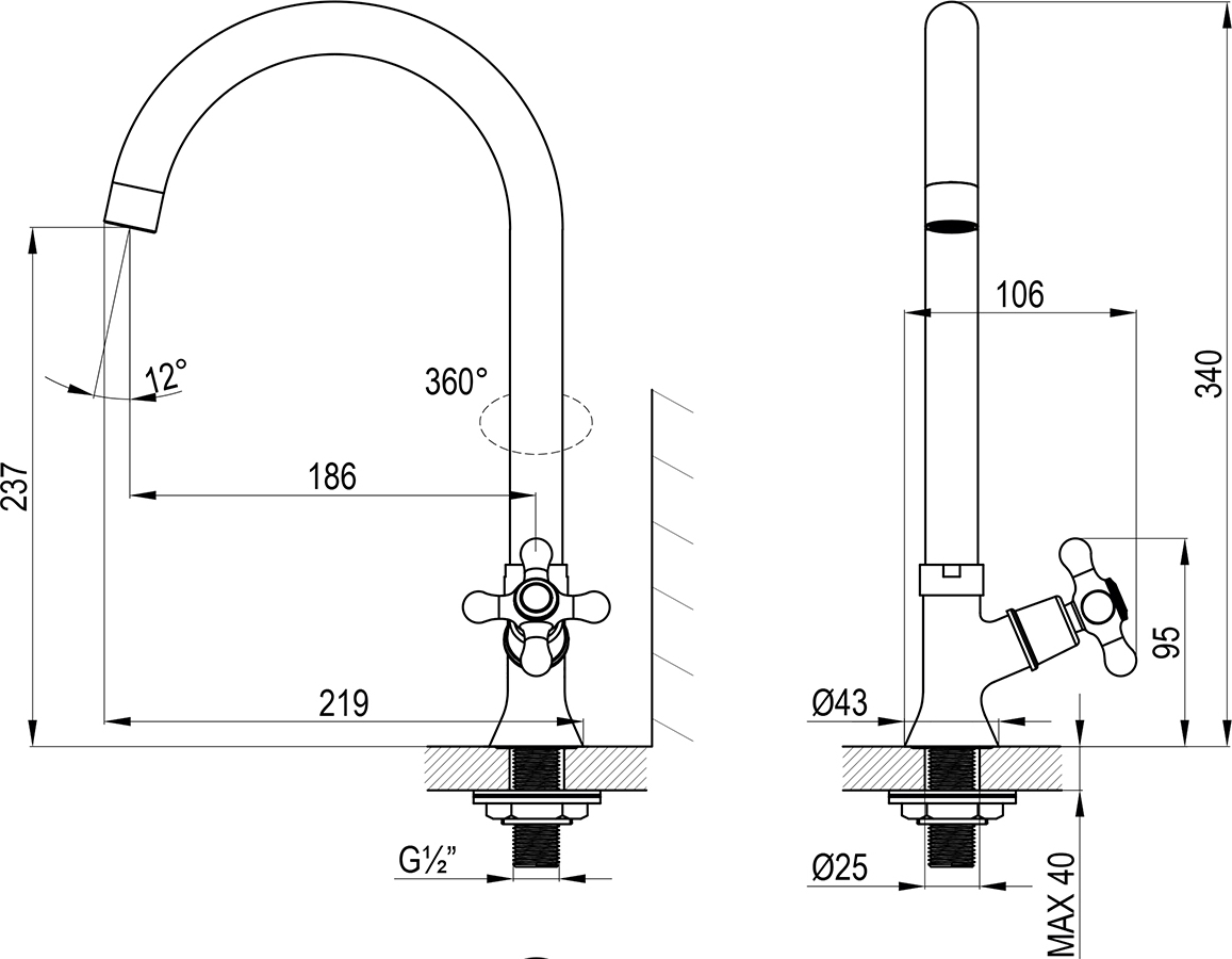 - Корпус крана с высоким поворотным изливом с аэратором, кран-буксой с керамическими пластинами и металлической рукояткой Присоединительная группа для настольного крепления