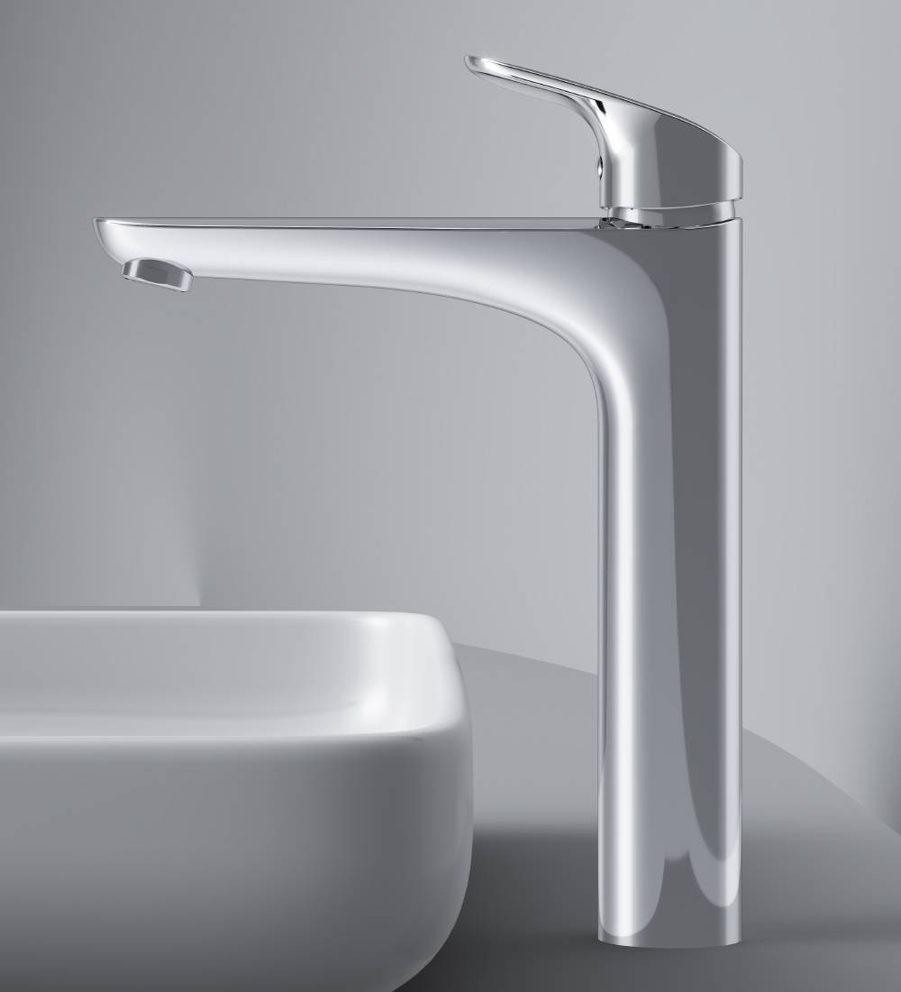 Высокий излив придает смесителю утонченный вид и идеально подойдет для раковины с глубокой чашей, а благодаря обширной зоне движения ручки управлять температурой воды еще проще.