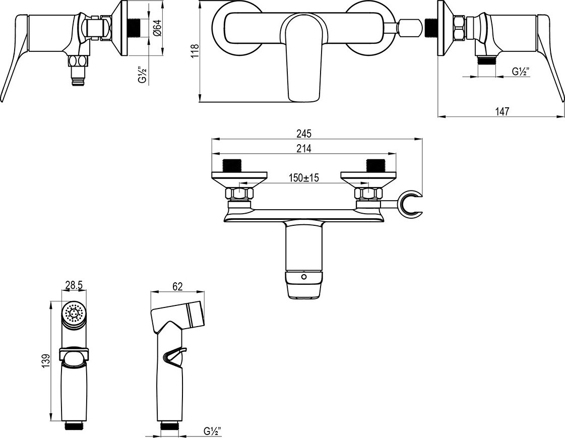 - гигиенический душ, держатель душевой лейки, душевой шланг, смеситель
