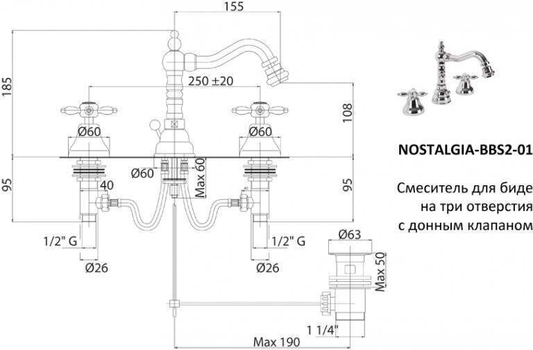 Смеситель CEZARES NOSTALGIA-BBS2-01, на биде, на три отверстия, с донным клапаном, хром, ручка хром УТ-00019064