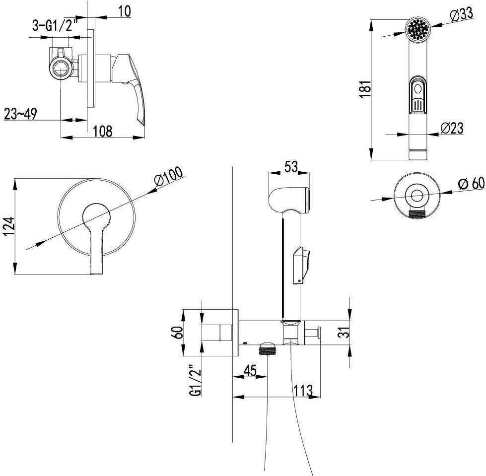 - скрытая монтажная часть, гигиенический душ, держатель душевой лейки, смеситель