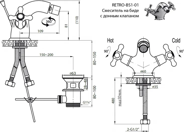- гибкая подводка, донный клапан, смеситель