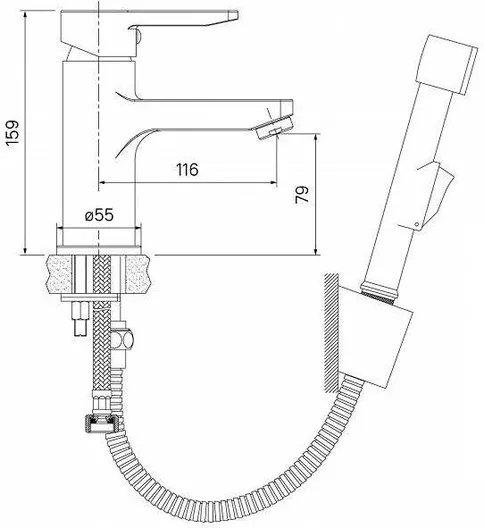 - гибкая подводка, гигиеническая лейка, держатель для лейки с креплением, шланг 1,5 м из нержавеющей стали, крепеж.
