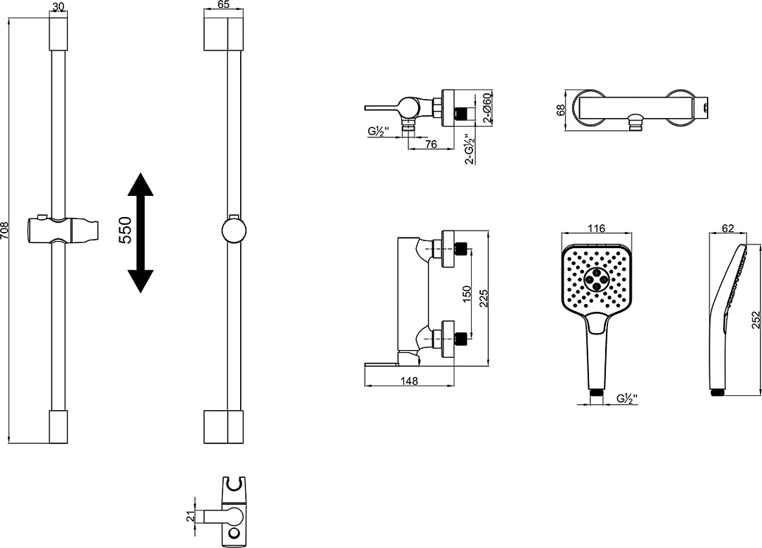 - душевая лейка, держатель душевой лейки, душевой шланг, смеситель