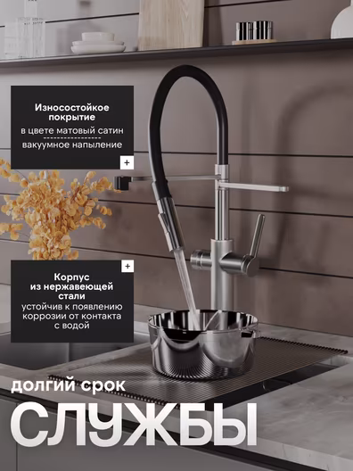 Однозахватный смеситель для кухни с гибким поворотным изливом Agger Elegant с возможностью подключения фильтра – эргономичное решение для тех, кто заботится о своем здоровье и здоровье близких. Фирменный керамический картридж Agger и эргономичный рычаг делают легким управление напором и температурой воды. Корпус изделия изготовлен из высококачественной нержавеющей стали, не подверженной коррозии от длительного контакта с водой. Износостойкое покрытие в цвете матовый сатин нанесено по технологии вакуумного напыления (PVD), на нем незаметны разводы от высохшей воды и отпечатки пальцев. Встроенный аэратор Neoperl экономит воду и, обогащая струю воздухом, делает ее мягкой без брызг. Смеситель оснащен гибким изливом (2 режима струи), что упростит мытье посуды и гигиеническую уборку мойки. В комплекте гибкая подводка (600 мм). Стандарт подводки - 1/2. Гарантия 5 лет.