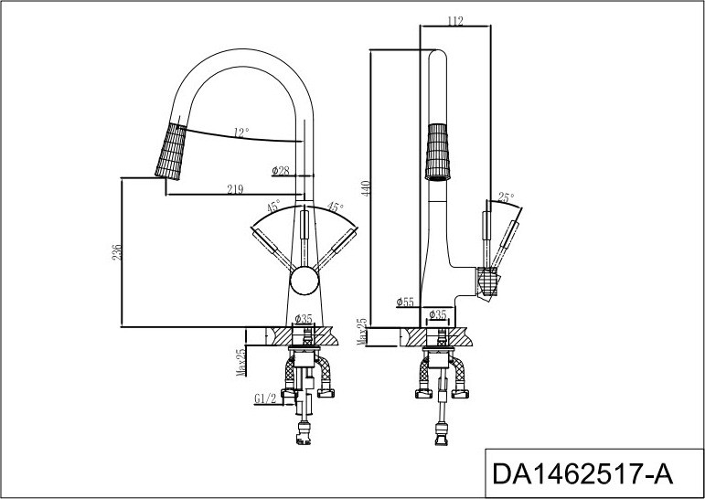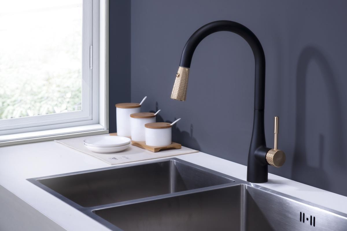 Смеситель D&K Rhein.Schiller DA1462517A для кухонной мойки, с выдвижной лейкой, черный-золото