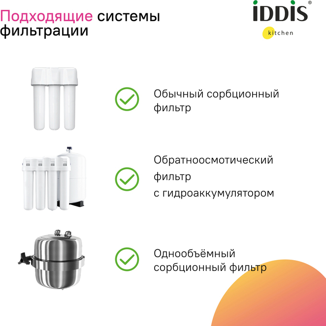 Встроенный канал для фильтрованной воды – можно наслаждаться чистой питьевой водой прямо из-под крана. Удобно переключение одним нажатием кнопки. Фильтр в комплекте не идёт и приобретается отдельно.