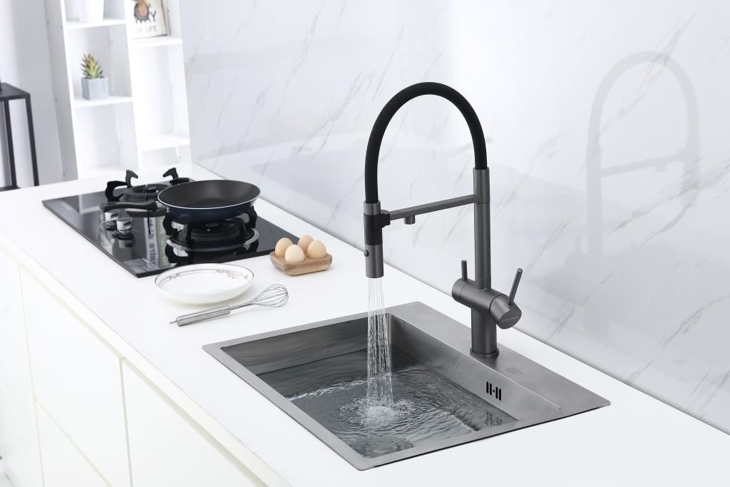У смесителя есть 2 режима подачи воды: мощная струя и деликатный душ, что также очень удобно при мытье посуды. Отдельный аэратор для питьевой воды позволяет разделить потоки воды: питьевая и водопроводная вода не смешиваются, поступая по разным каналам.