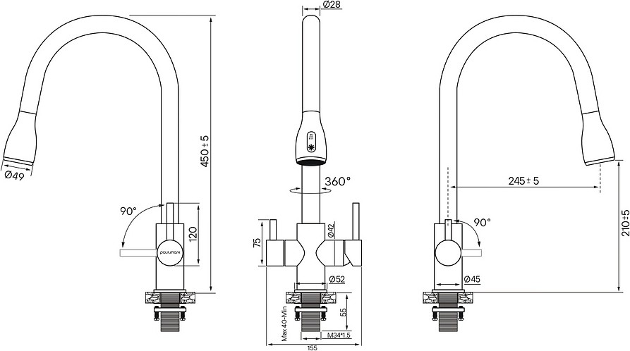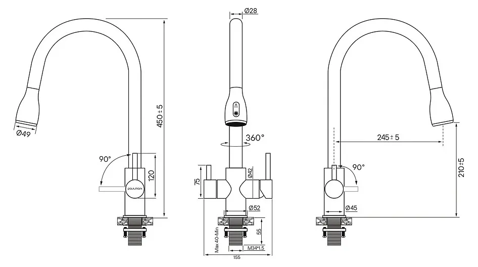 Смеситель Paulmark LANGE под фильтрованную воду с выдвижным шлангом,La214212-401, антрацит