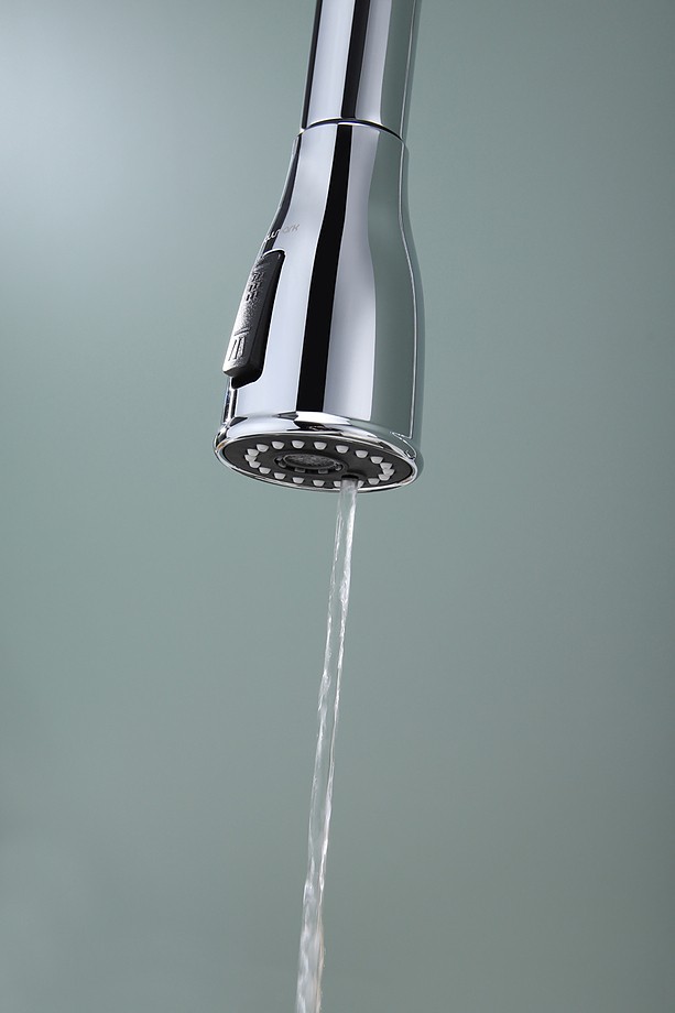 Конструкция смесителя с вытяжным шлангом значительно облегчает процесс мойки посуды или продуктов любого размера и формы.
