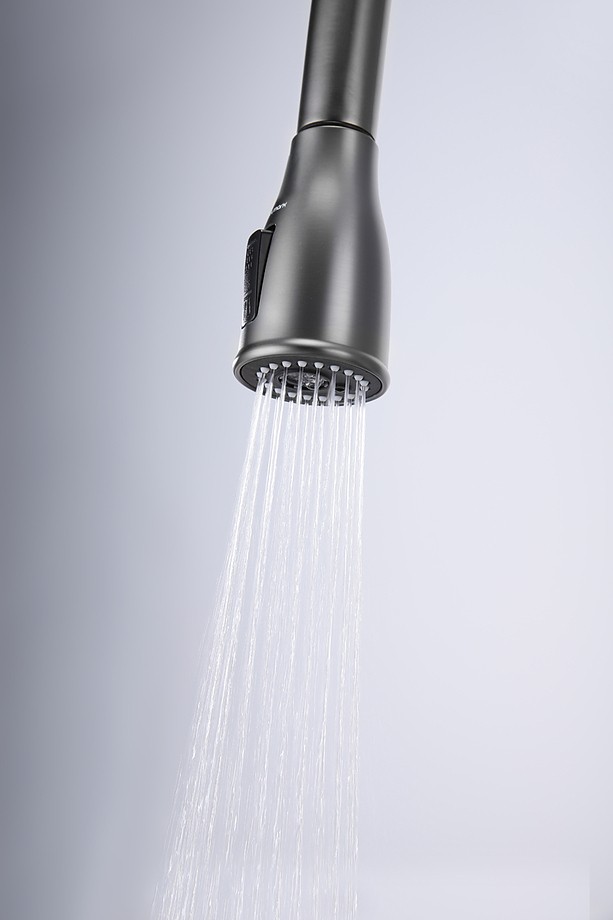 Конструкция смесителя с вытяжным шлангом значительно облегчает процесс мойки посуды или продуктов любого размера и формы.