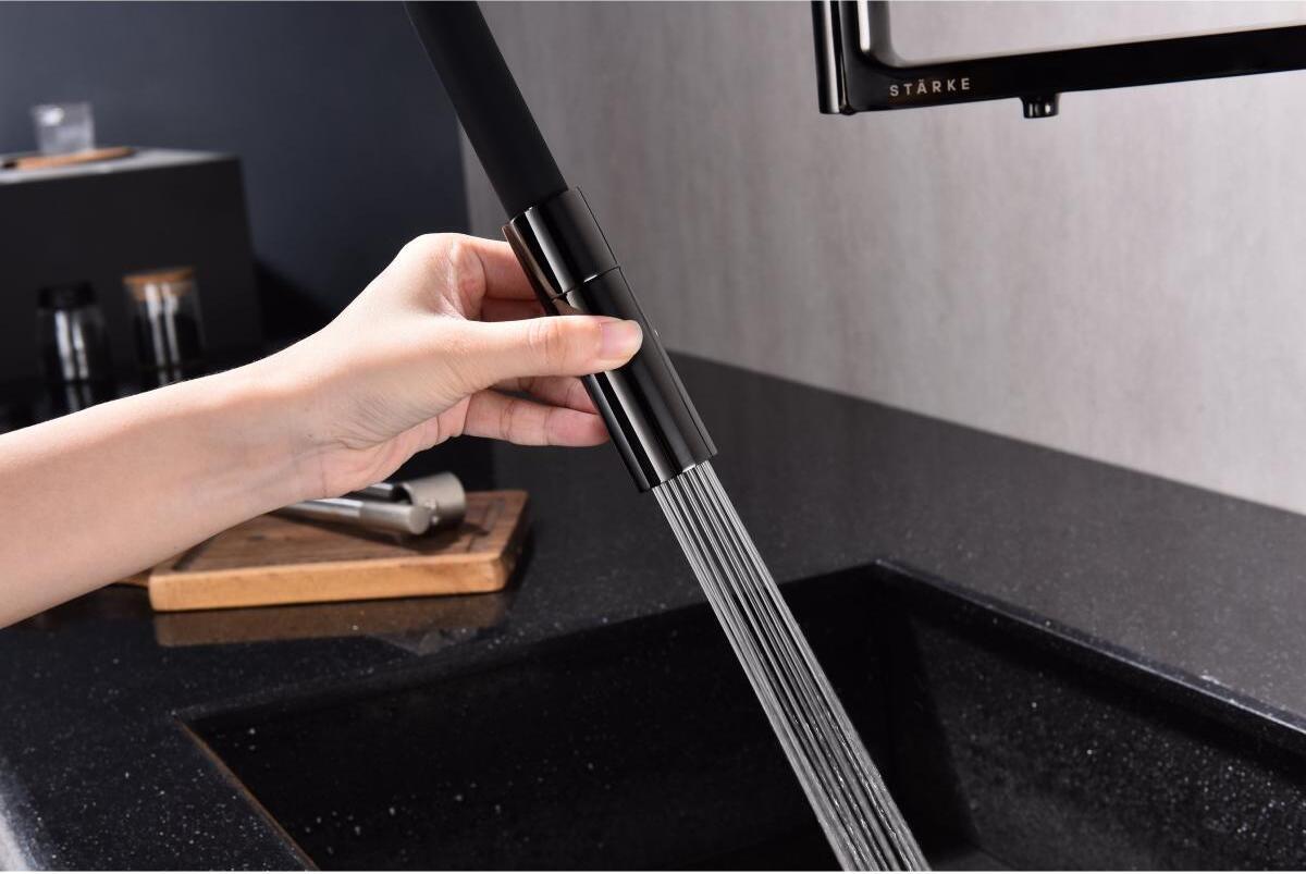 У смесителя есть 2 режима подачи воды: мощная струя и деликатный душ, что также очень удобно при мытье посуды. Отдельный аэратор для питьевой воды позволяет разделить потоки воды: питьевая и водопроводная вода не смешиваются, поступая по разным каналам.