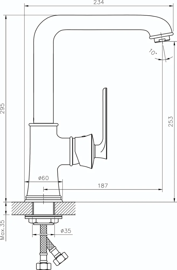 В смеситель установлен картридж D-35 с керамическими пластинами. Высота смесителя 295 мм. Излив поворотный, 187 мм. Высота излива до аэратора 253 мм. Аэратор изготовлен из пластика с нержавеющим корпусом, угол наклона аэратора- 10 гр.