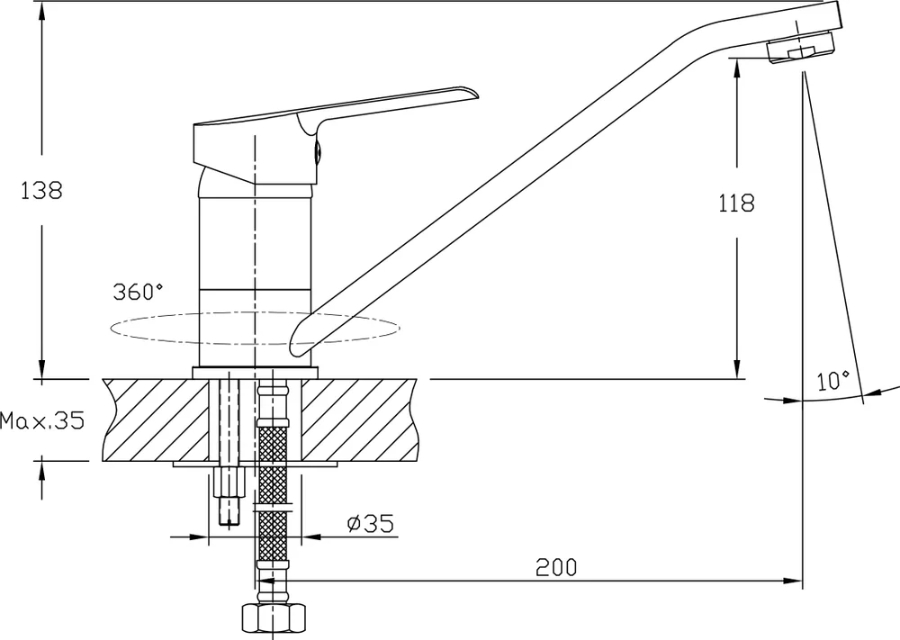 В смеситель установлен картридж D-35 (RSH102) с керамическими пластинами. Высота смесителя 109 мм. Излив поворотный 360гр, 200 мм. Высота излива до аэратора 118 мм. Аэратор изготовлен из пластика с нержавеющим корпусом, угол наклона аэратора 10 гр.