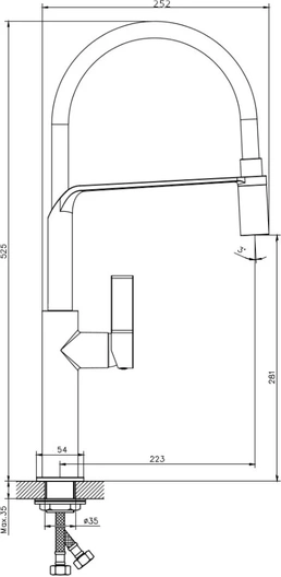 В смеситель установлен картридж D-35 с керамическими пластинами. Высота смесителя 525 мм. Излив 223 мм. Высота излива до аэратора 281 мм. Аэратор изготовлен из пластика с нержавеющим корпусом, угол наклона аэратора- 3 гр.