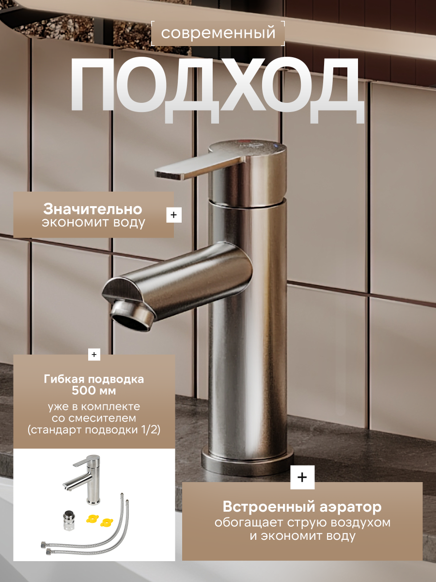 Однозахватный смеситель для раковины Agger Easy с фиксированным изливом гармонично дополнит интерьер ванной комнаты в современном или традиционном стиле. Фирменный керамический картридж Agger и эргономичный рычаг делают легким управление напором и температурой воды. Корпус изделия изготовлен из высококачественной нержавеющей стали, не подверженной коррозии от длительного контакта с водой. Износостойкое покрытие в цвете матовый сатин, за которым очень просто ухаживать мягкой салфеткой, нанесено методом вакуумного напыления. Встроенный аэратор экономит воду и, обогащая струю воздухом, делает ее мягкой без брызг. Гибкая подводка 50 см.