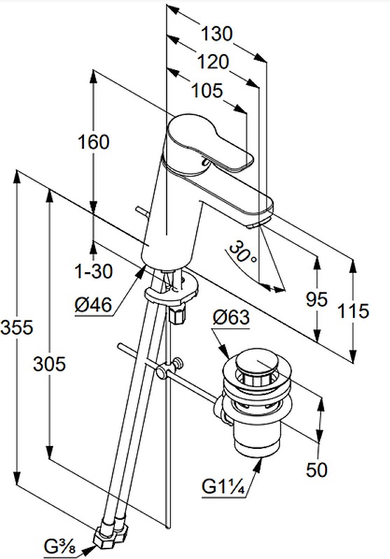 - аэратор, гибкая подводка, крепления, донный клапан, смеситель