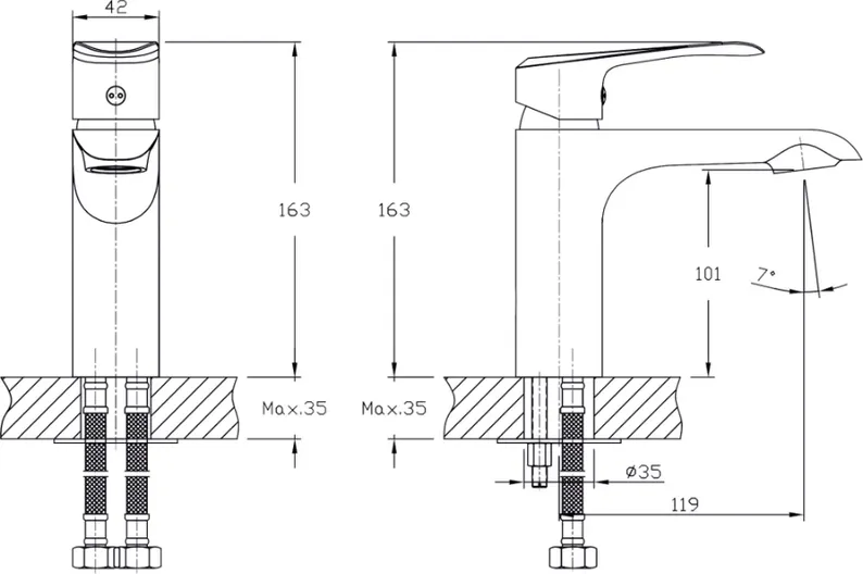 В смеситель установлен картридж D-35 с керамическими пластинами. Высота смесителя 163 мм. Излив литой неповоротный 119мм., высота излива до аэратора 101 мм. Аэратор изготовлен из пластика с нержавеющим корпусом, угол наклона аэратора- 7 гр.