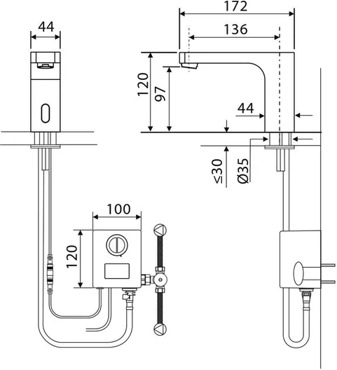 - Смеситель сенсорный - 1 шт. Соединительный шланг 600мм - 1 шт. Блок управления с отсеком для батареек - 1 шт. Смесительный клапан - 1 шт. Электромагнитный клапан с адаптером - 1 шт. Подводка 400мм - 2 шт. Крепежный кронштейн -1 шт. Набор креплений - 1 шт.