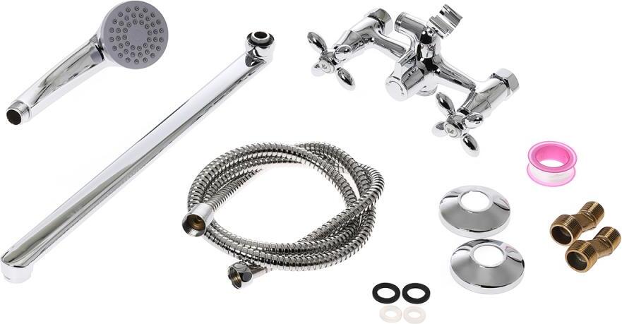- аэратор, эксцентрики, душевая лейка, держатель душевой лейки, душевой шланг, смеситель