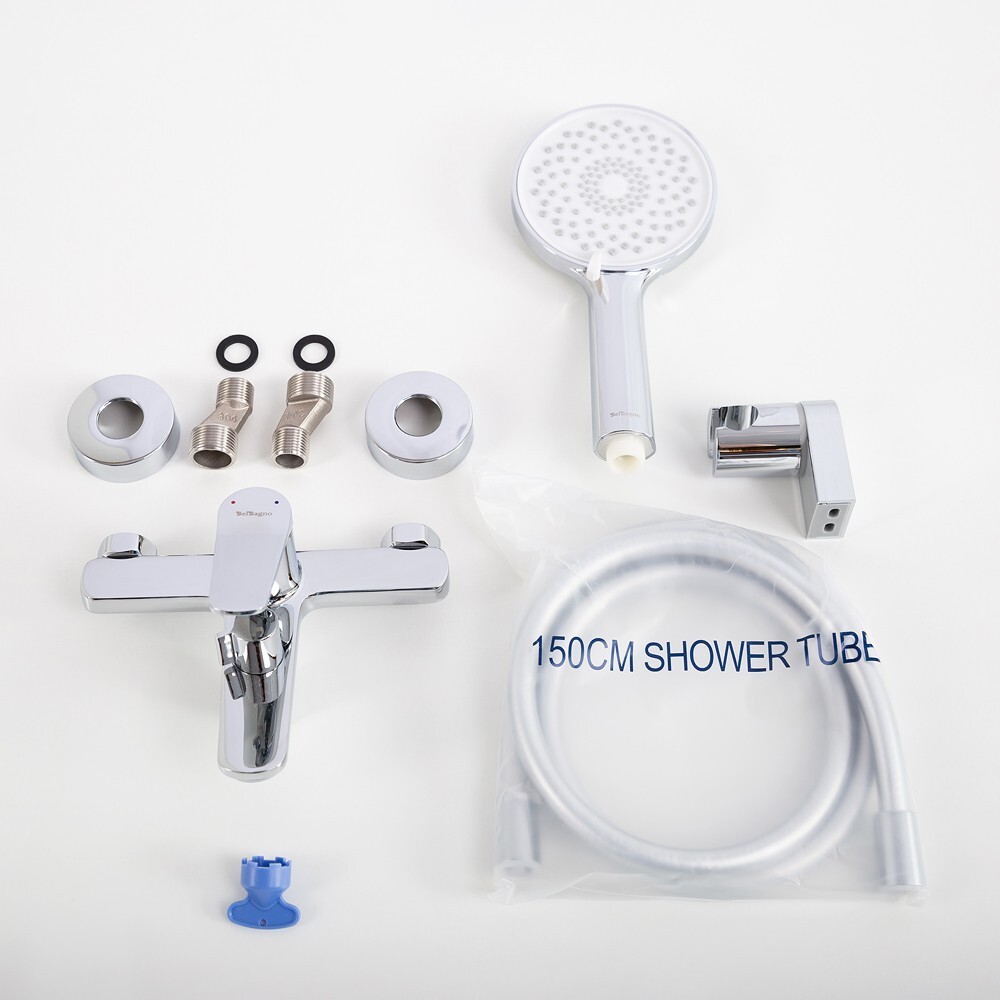 • В комплекте со смесителем: 3-х режимная душевая лейка из ABS-пластика, душевой шланг PVC 150 см, поворотный держатель душевой лейки