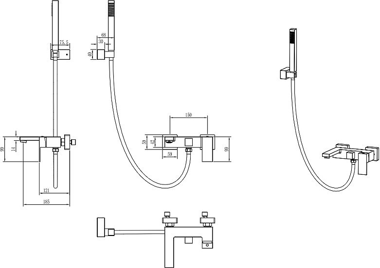 - аэратор, эксцентрики, душевая лейка, держатель душевой лейки, душевой шланг, смеситель