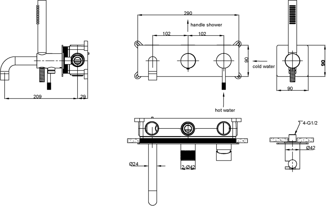 - аэратор, душевая лейка, держатель душевой лейки, душевой шланг