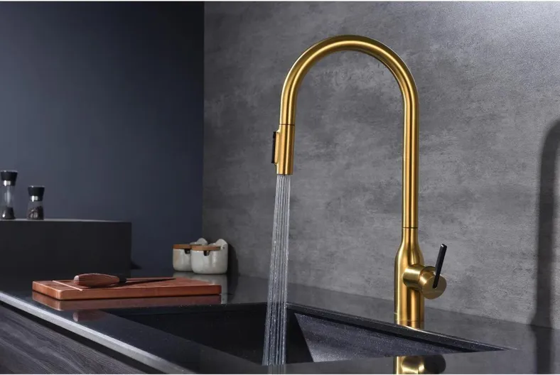 Смеситель для кухни UNIVERSAL Un213880-BG, брашированное золото с выдвижным изливом и возможностью подключения системы фильтрации питьевой воды.