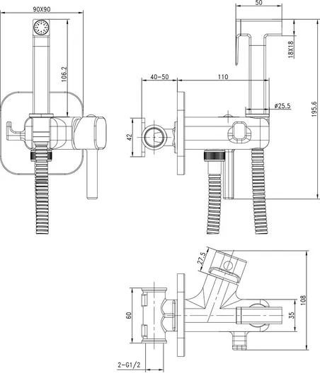 - Аксессуары в комплекте: лейка гигиенического душа с нажимным механизмом, душевой шланг 1,2 м (Turn-Free)