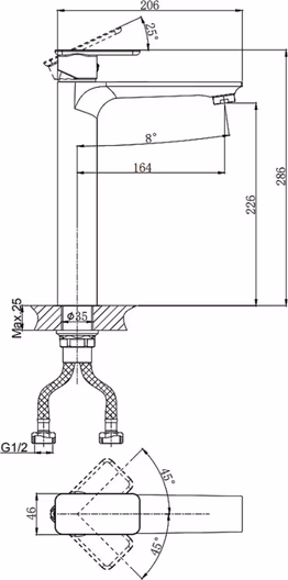 В смеситель установлен картридж D-35 с керамическими пластинами. Высота смесителя 286 мм. Излив литой, неповоротный 164 мм. Высота излива до аэратора 226 мм. Аэратор изготовлен из пластика с нержавеющим корпусом, угол наклона - 8 гр.