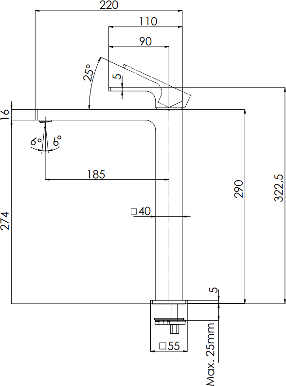- Высота излива, см: