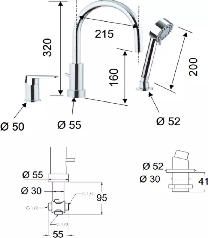 - гибкая подводка, крепления, душевая лейка, душевой шланг, смеситель