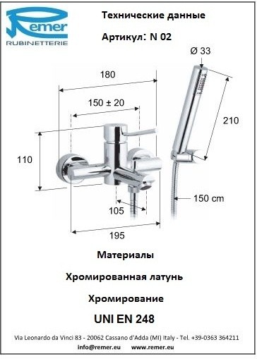 Смеситель Remer Minimal N02 для ванны с душем УТ-00151909