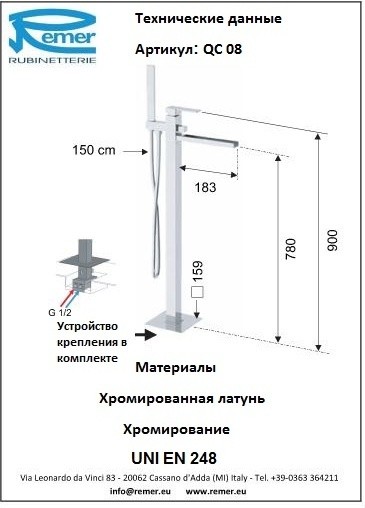 Смеситель Remer Qubika Cascata QC08 для ванны с душем УТ-00151957