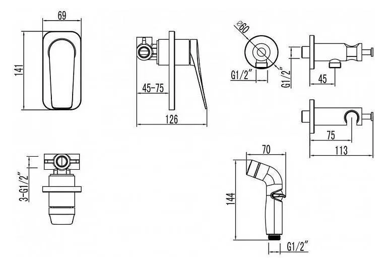 - гигиенический душ, держатель душевой лейки, душевой шланг, смеситель