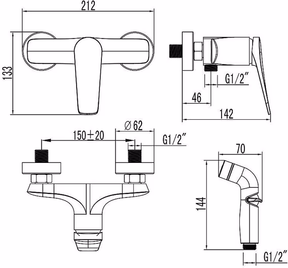 - гигиенический душ, держатель душевой лейки, душевой шланг, смеситель