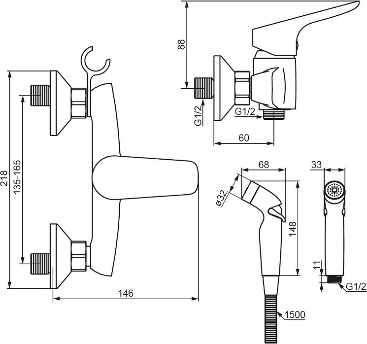 Смеситель с гигиеническим душем имеет компактный размер и монтируется непосредственно в стену что помогает установить его даже в небольших санузлах.