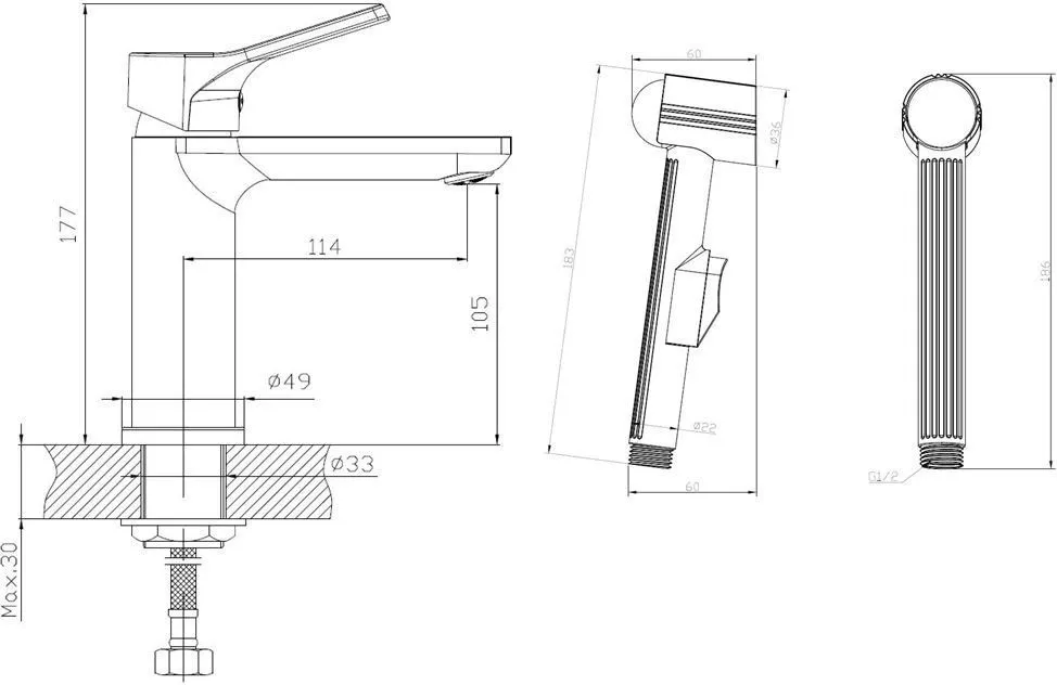 - аэратор, гибкая подводка, гигиенический душ, душевой шланг, смеситель