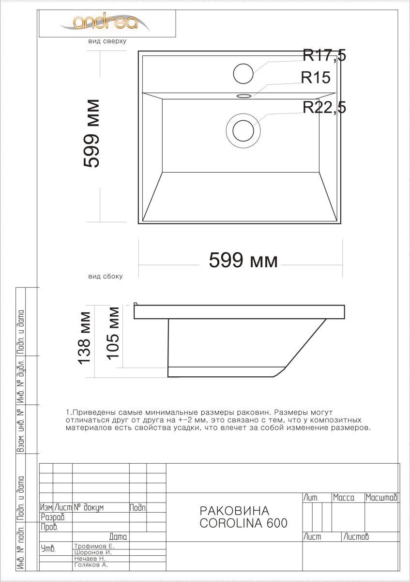 Раковина Andrea COROLINA 60, литьевой мрамор