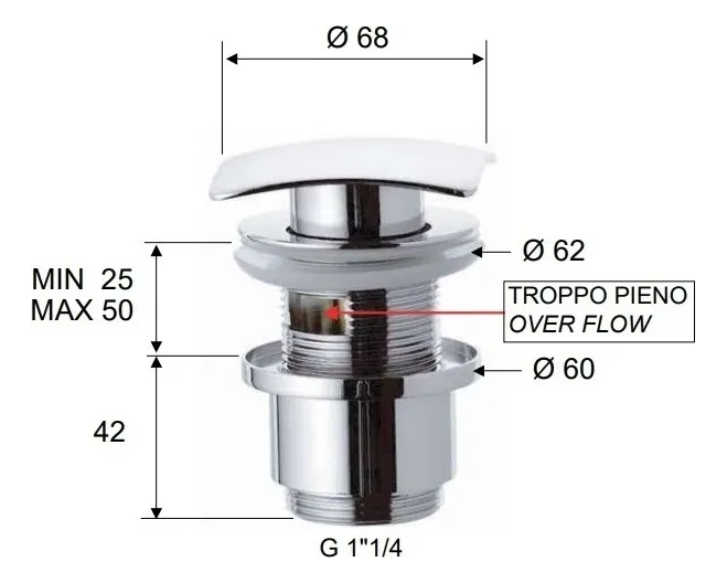 Remer 905SCC2114 Выпуск для раковины с переливом (хром). Автоматический 1 1/4", c большой квадратной заглушкой и системой click-clack (на пружине), короткий стакан. С переливом. Сделано в Италии.