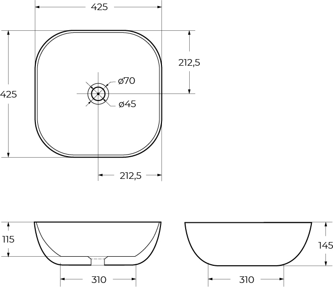 - Габаритные размеры раковины: 425х425х145 мм