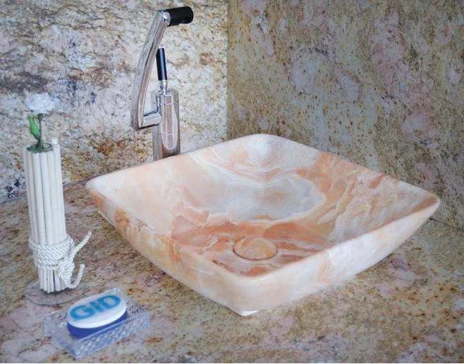 Керамическая дизайнерская раковина Gid Mnc179 покрыта каменной фактурой оранжевого оттенка со светлыми прожилками путём современных высокотехнологических процессов.