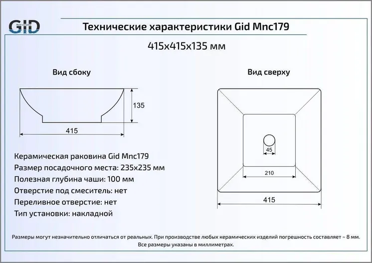 Раковина для ванной Gid Mnc179 монтируется на столешницу или мебель.
