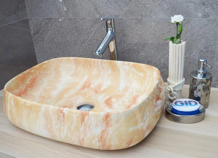 Керамическая дизайнерская раковина Gid Mnc185 покрыта каменной фактурой оранжевого оттенка путём современных высокотехнологических процессов.