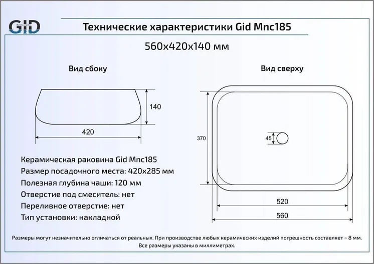 Раковина для ванной Gid Mnc185 монтируется на столешницу или мебель.