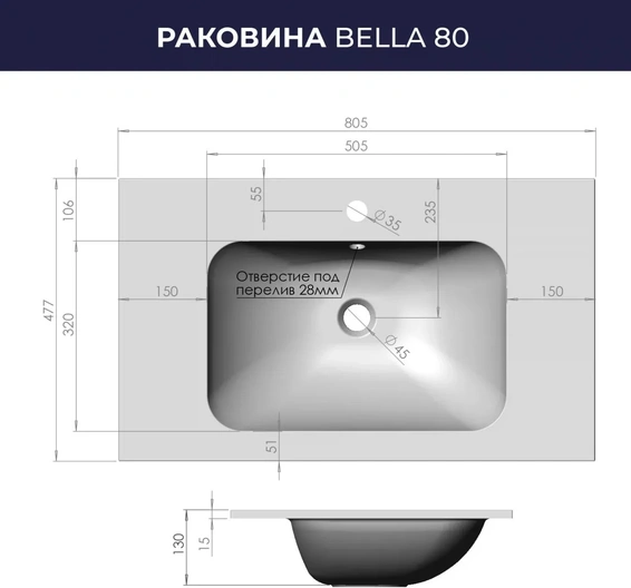 Раковина для ванной Итана Bella 80 805х477х130 изготовлена из искусственного камня. Искусственный камень - это современное и практичное решение для ванной комнаты. Верхний слой Гелькоута образует декоративное защитное покрытие, которое легко мыть. Не содержит вредных для здоровья человека веществ, экологически безопасный. Шумопоглощающая поверхность. Имеет одно готовое отверстие под смеситель. Раковина может быть встроена на мебель, в столешницу и на подстолье. Изделия коллекции отлично впишутся в популярные и современные интерьерные решения для ванных комнат.
